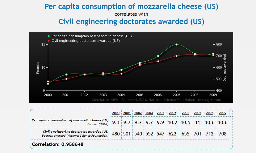 It also appears that increased mozzarella consumption leads to more doctorates in civil engineering in the United States. Maybe hungry American PhD students eat more cheese?