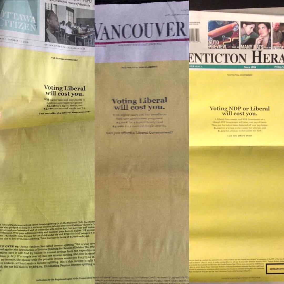 The front pages of three of Postmedia’s newspapers with the Conservative Party advertisement. (credit: Todd Barriage/Instagram)