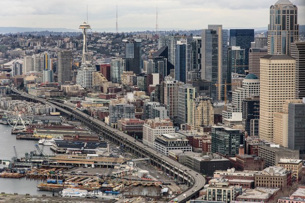 Alaskan Way Viaduct in downtown Seattle, which will be demolished during the “Seattle Squeeze”. (credit: Flickr/Washington State Department of Transportation)