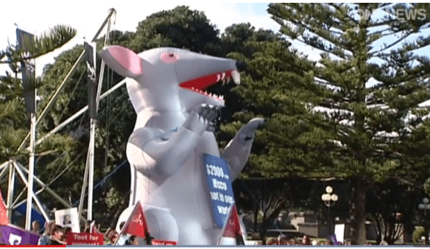 The news story that alerted me to this case notes that Scabby was actually on loan to First Union from another New Zealand union, but that First Union has its own “big fat inflatable pig” that also appears at its protests. A First Union representative told the newspaper, “Giant blow up representations of these animals outside their stores draws public attention to this bad behaviour and are intended to make employers think twice about their treatment of workers.”